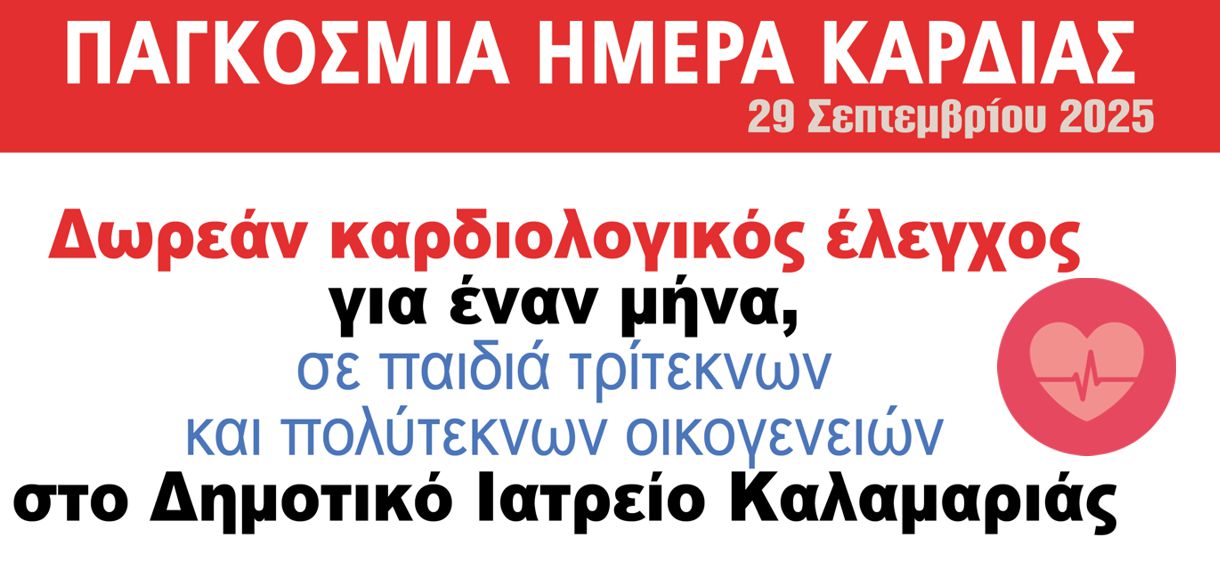 Ο Δήμος Καλαμαριάς σε συνεργασία με τον Σύλλογο Βορείου Ελλάδος «Παιδικές Καρδιές», προσφέρει δωρεάν καρδιολογικούς ελέγχους για τα παιδιά τρίτεκνων και πολύτεκνων οικογενειών που κατοικούν στην Καλαμαριά.