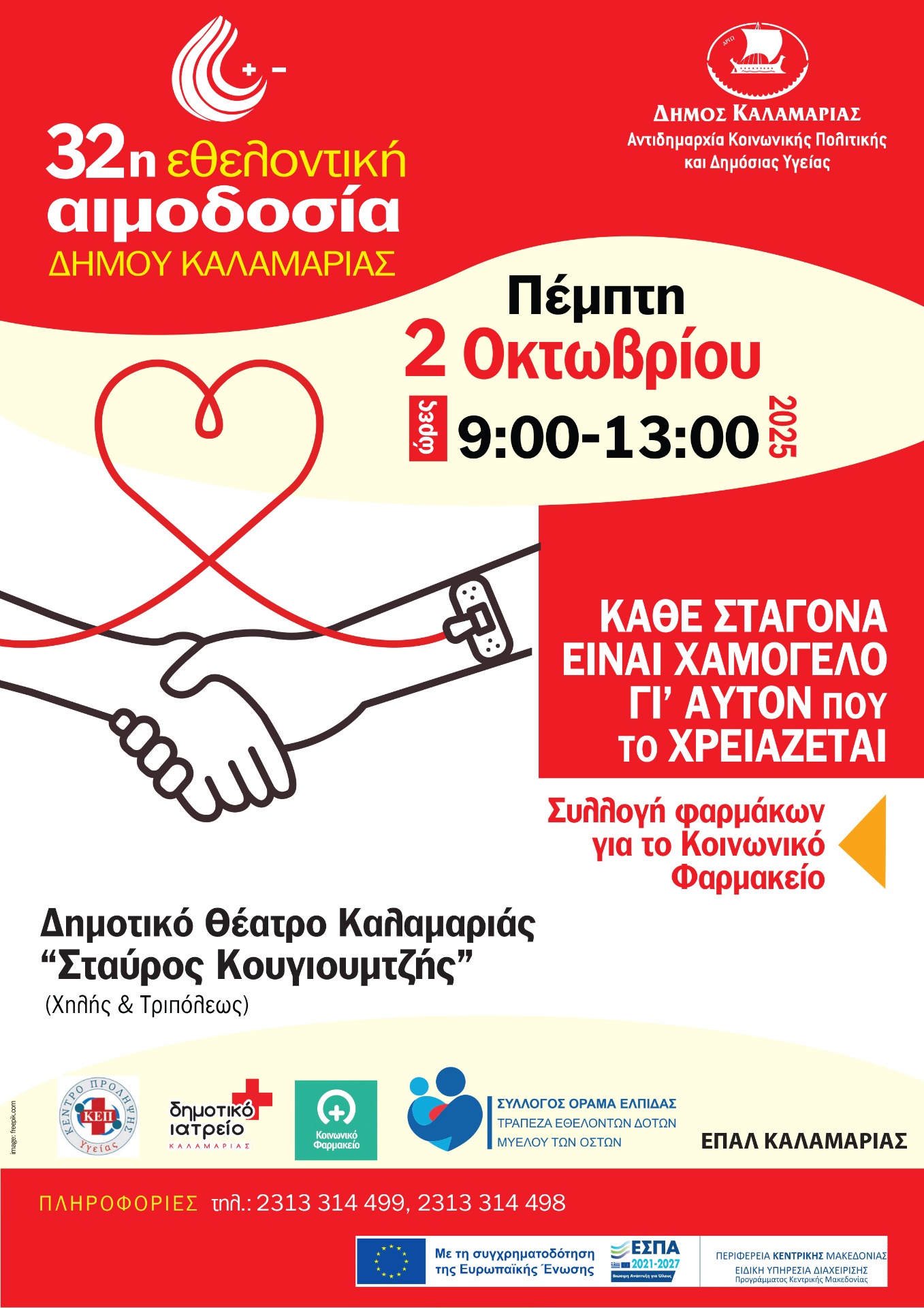 «Κάθε σταγόνα είναι χαμόγελο γι' αυτόν που το χρειάζεται»: Με το σύνθημα αυτό, ο Δήμος Καλαμαριάς διοργανώνει την 32η Εθελοντική Αιμοδοσία, την Πέμπτη 2 Οκτωβρίου 2025, από τις 09:00 έως τις 13:00, στο Δημοτικό Θέατρο Καλαμαριάς «Σταύρος Κουγιουμτζής» (Χηλής & Τριπόλεως), σε συνεργασία με το Νοσοκομείο ΑΧΕΠΑ.