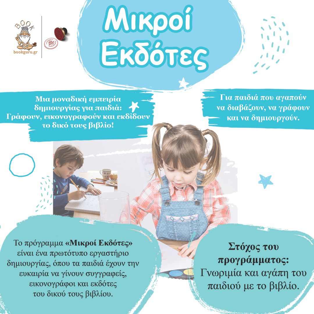 Οι Εκδόσεις Πηγή Παιδείας, λαμβάνοντας υπόψη το χαμηλό ποσοστό φιλαναγνωσίας στα παιδιά, δημιούργησαν το πρόγραμμα «Μικροί Εκδότες» – ένα μοναδικό εργαστήριο δημιουργίας βιβλίου! Τα παιδιά γίνονται συγγραφείς, εικονογράφοι και εκδότες του δικού τους βιβλίου.