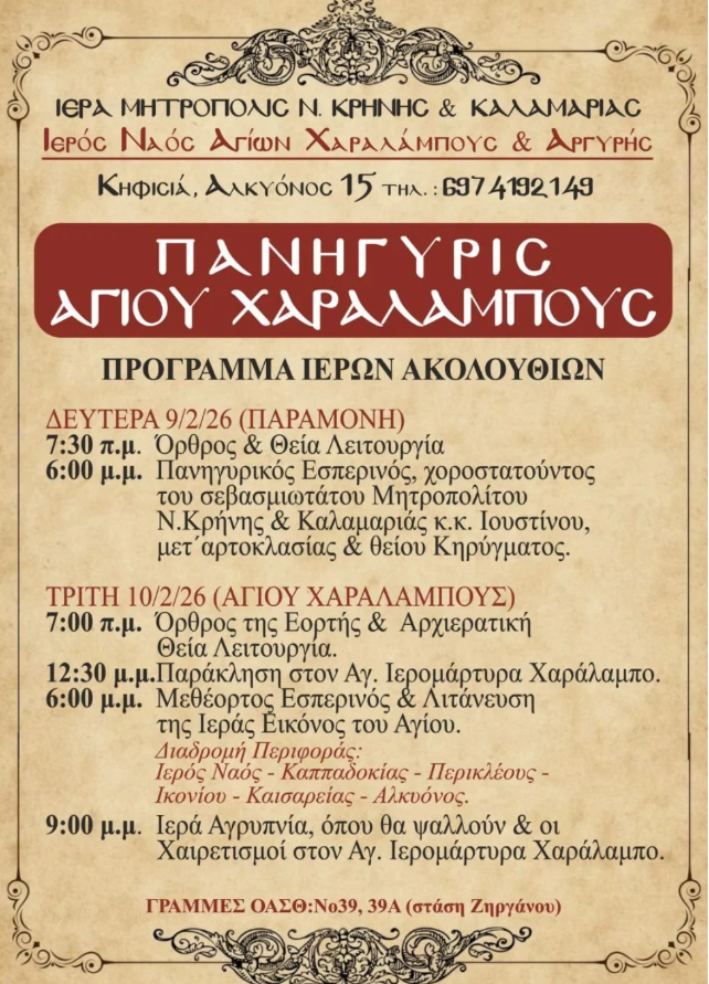 Καλαμαριά : Πρόγραμμα πανηγύρεως Ι.Ν. Αγίων Χαραλάμπους και Αργυρής Κηφισιάς