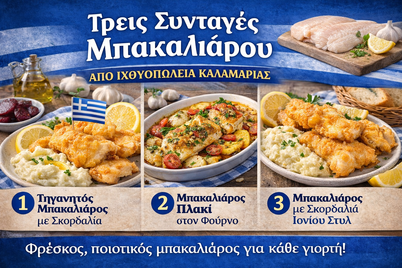 Ο κλασικός μπακαλιάρος με σκορδαλιά είναι ένα από τα πιο εμβληματικά ελληνικά πιάτα 🥇 — ειδικά για την 25η Μαρτίου.