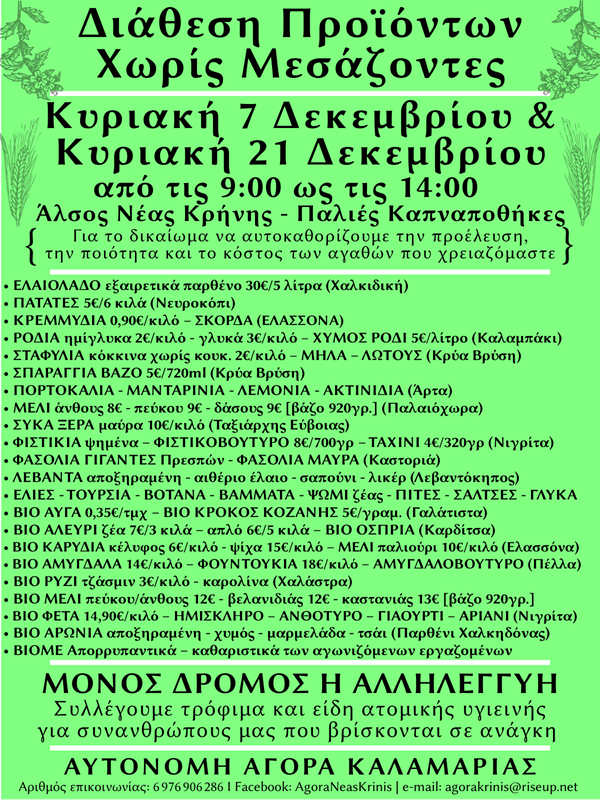 Η Αυτόνομη Αγορά Καλαμαριάς, σε συνεργασία με τους συμμετέχοντες παραγωγούς, ανακοινώνει δύο νέες δράσεις διάθεσης προϊόντων χωρίς μεσάζοντες.
